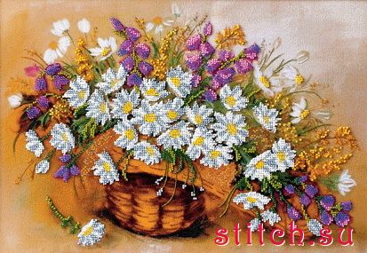 Набор «Ромашки и колокольчики» Производитель «Чарiвна Мить»У данного производителя, интересные, на мой взгляд, сюжеты, но очень страдает, что-нибудь. В данном наборе, отслеживается, какой-то определенный брак в цветовой палитре картинки. Цвет рисунка рыже-кирпичного цвета, размазанный жуткими пятнами. Местами плохо прокрашены цветы. Бисер вполне сносный. На вышивку хватило. Схема вышивки читаемая. Багетная мастерская спасла картинку! Даже самой понравилась …