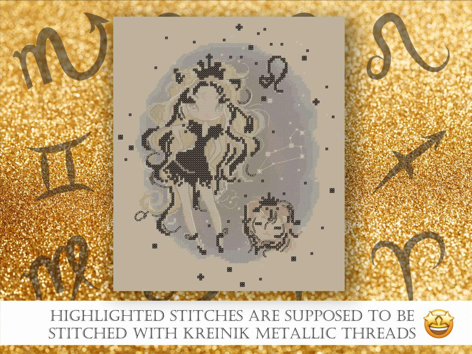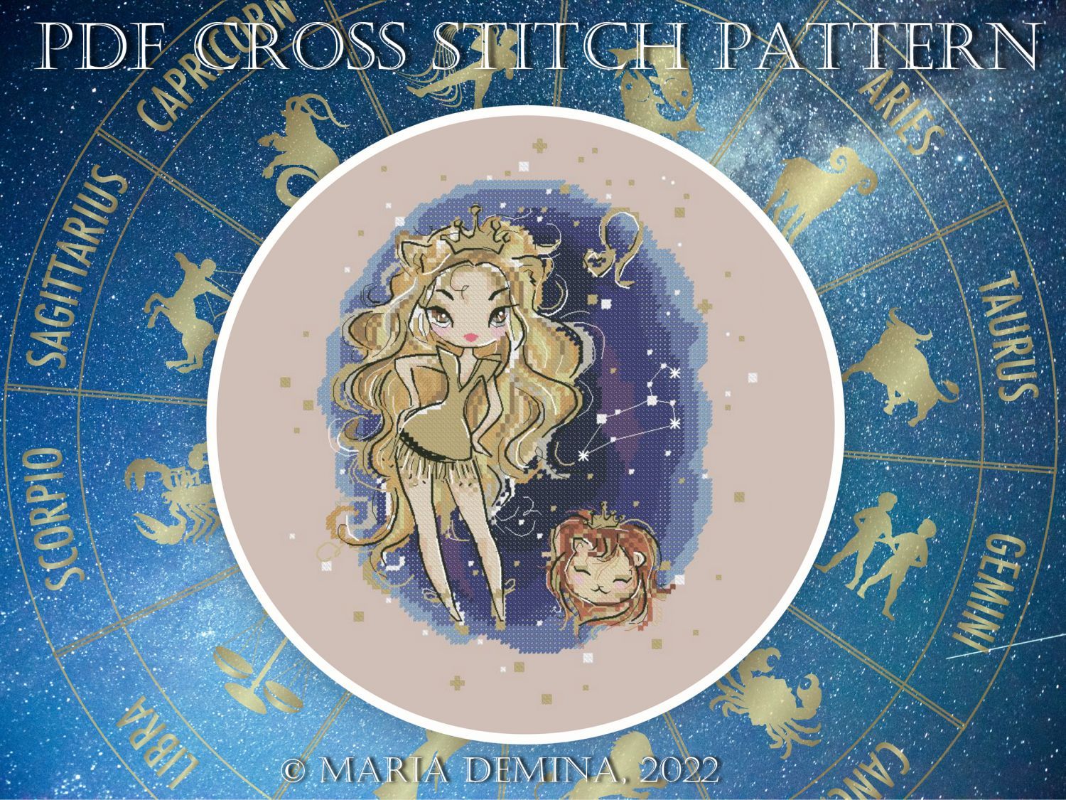 Знаки Зодиака - Лев (в файле - два варианта цвета кожи). Размер 104х123 крестиков, 20 цветов DMC, 1 цвет Kreinik, 2 бленда.