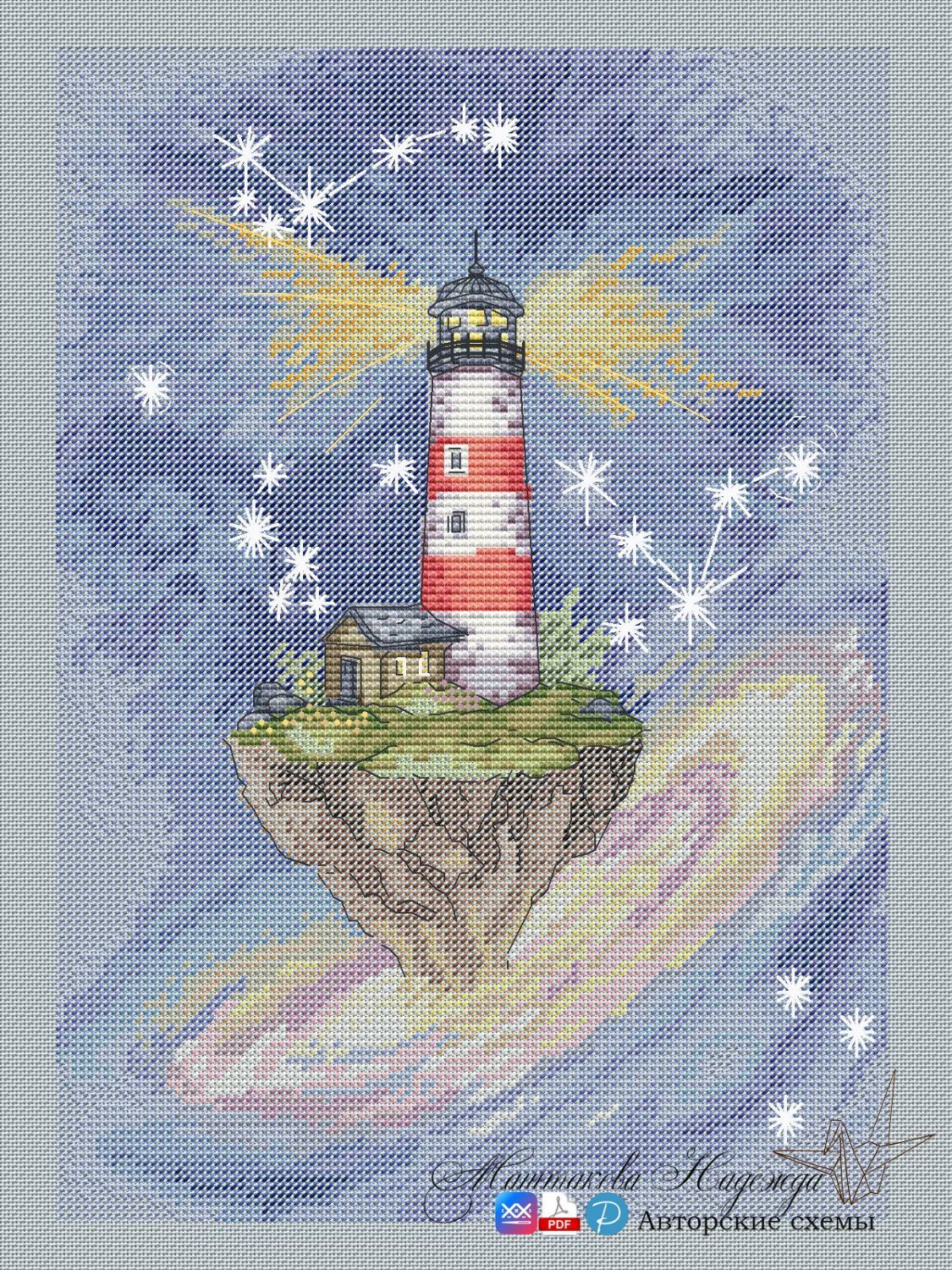 "Путеводный маяк". Размер 105х148 крестиков, 50 цветов из них 24 бленда, ДМС, Gamma и ПНК им.Кирова.