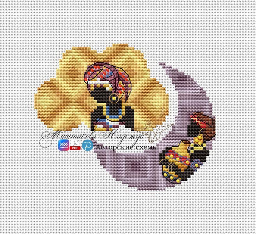 Размер облака 43х28 крестиков, размер месяца 40х41 крестик, 19 цветов, 2 цв.бисера, 1 цв.metallic + бленды, ДМС (ПНК и Гамма).