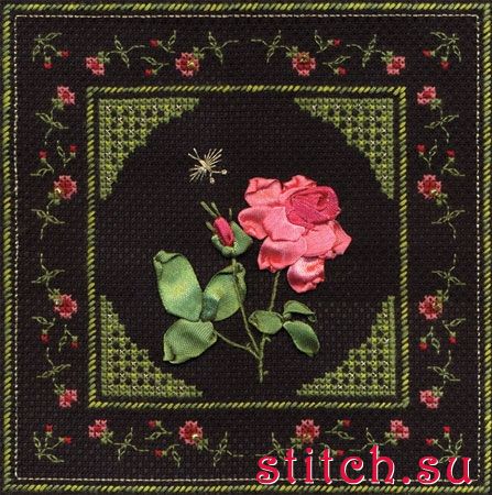 Нежная роза, 17х17, 5 цветов, счетный крест и вышивка лентами
